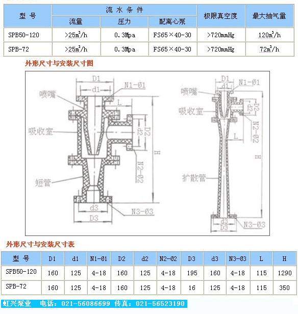 SPB型玻璃鋼水噴射真空泵SPB型玻璃鋼水噴射真空泵是一種具有抽真空、冷凝、排水等三種有效能的機械裝置。它是利用一定壓力的水流通過對稱均布成一定傾斜的噴出。聚合在一個焦點上,由于噴射水流速度很高,于是周圍形成負壓使器室內產生真空,另外由于二次蒸氣冷凝成水,少量未被冷凝的蒸氣由與不凝結的氣體亦由于與高速噴射的水互相摩擦,混合與擠壓,通過擴壓管被排除,使器室內形成更高的真空。但目前生產水利噴射器的制造廠較小,品種亦不齊全,為此,我們近年來不斷改進設計,采用多噴咀與氣環(導向盤)等結構,以及用多級泵進水,低位安裝,吸需安裝高度4.5米,完善與提高了其工作性能,是真空冷凝設備的一種革新。